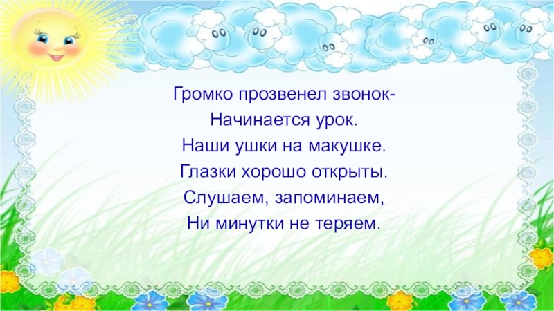 Громко прозвенел звонок-Начинается урок. Наши ушки на макушке.Глазки хорошо открыты.Слушаем, запоминаем,Ни минутки не теряем.