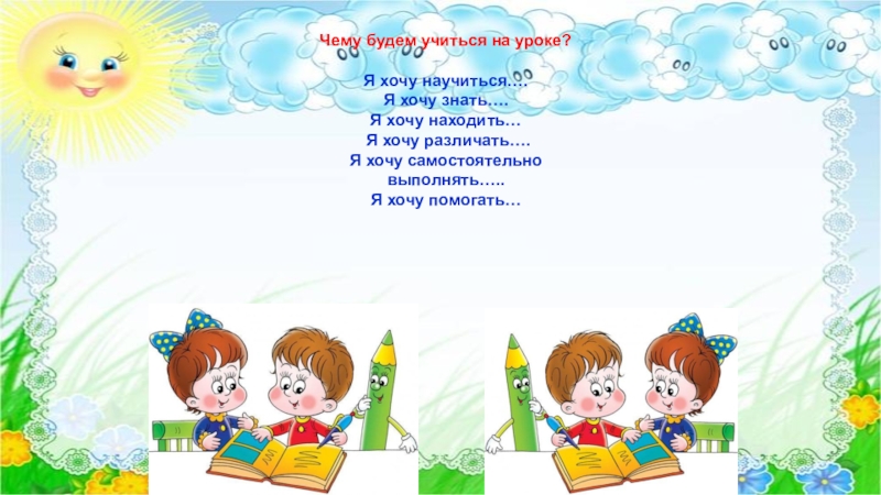 Чему будем учиться на уроке?Я хочу научиться….Я хочу знать….Я хочу находить… Я хочу различать….Я хочу самостоятельно выполнять…..Я