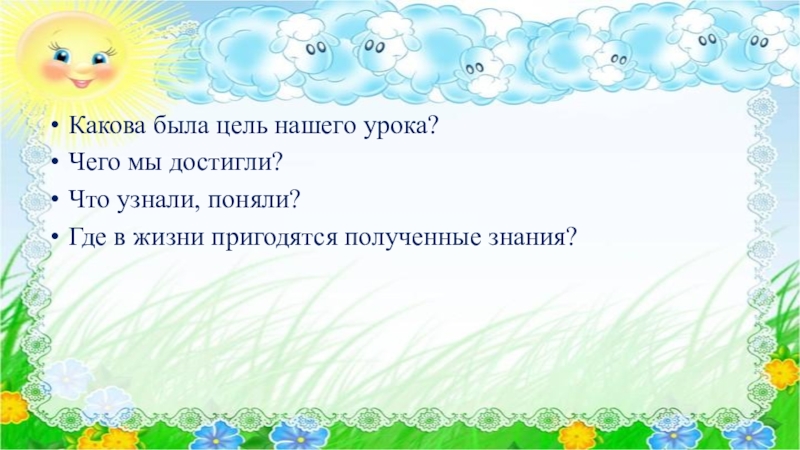 Какова была цель нашего урока?Чего мы достигли?Что узнали, поняли?Где в жизни пригодятся полученные знания?