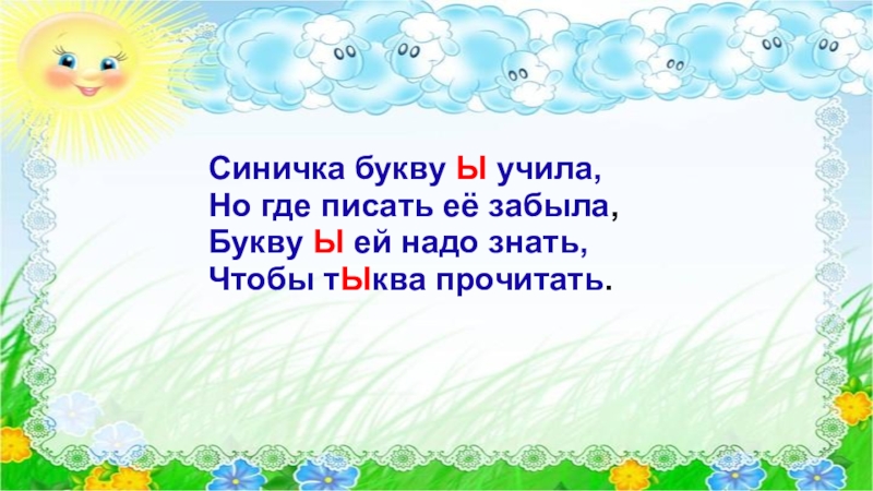 Синичка букву Ы учила, Но где писать её забыла, Букву Ы ей надо знать, Чтобы тЫква прочитать.