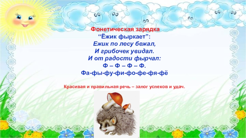 Фонетическая зарядка“Ёжик фыркает”:Ежик по лесу бежал,И грибочек увидал.И от радости фырчал:Ф – Ф – Ф – Ф.Фа-фы-фу-фи-фо-фе-фя-фёКрасивая