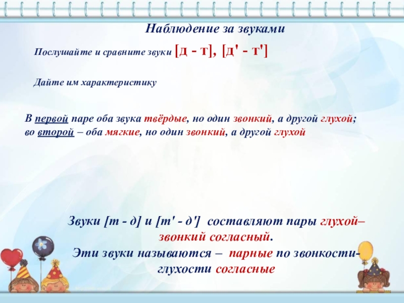 Звуки [т - д] и [т' - д'] составляют пары глухой–звонкий согласный.