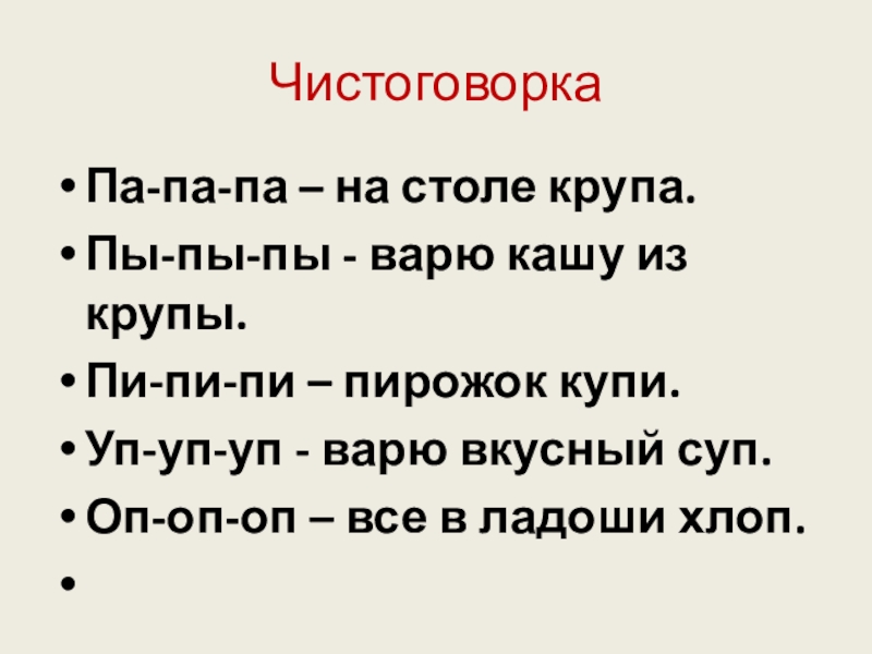 ЧистоговоркаПа-па-па – на столе крупа.Пы-пы-пы - варю кашу из крупы.Пи-пи-пи – пирожок купи.Уп-уп-уп - варю вкусный суп.Оп-оп-оп – все в ладоши хлоп.