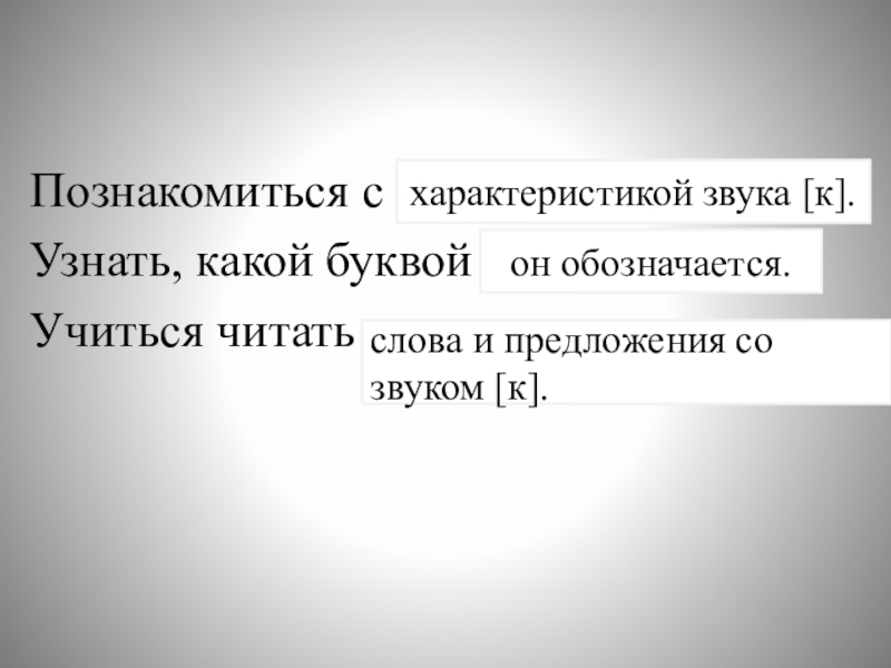 Познакомиться с …Узнать, какой буквой …Учиться читать …характеристикой звука [к]. он обозначается.  слова и предложения со