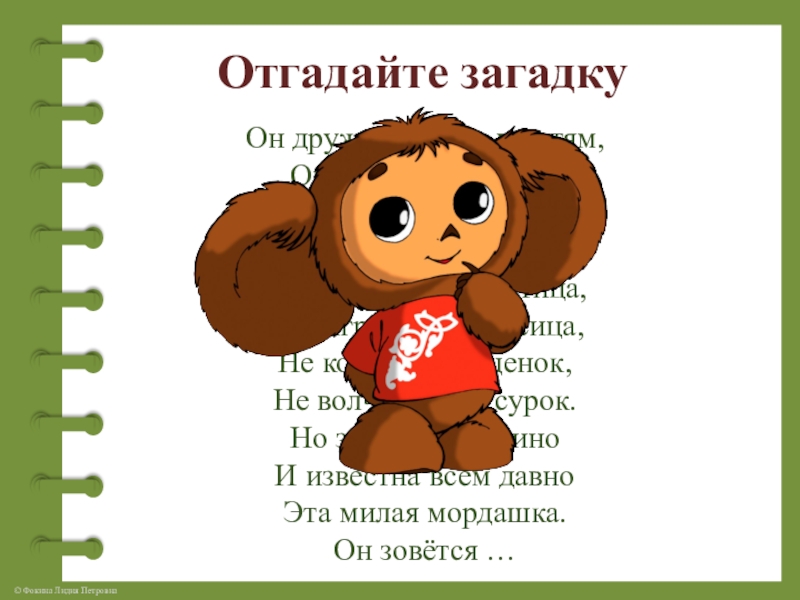 Отгадайте загадкуОн дружок зверям и детям,Он живое существо,Но таких на целом светеБольше нет ни одного.Потому что он