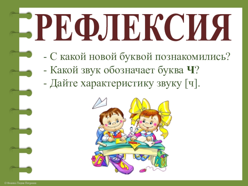 РЕФЛЕКСИЯ- С какой новой буквой познакомились?- Какой звук обозначает буква Ч? - Дайте характеристику звуку [ч].