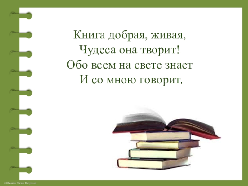 Книга добрая, живая, Чудеса она творит! Обо всем на свете знает И со мною говорит.