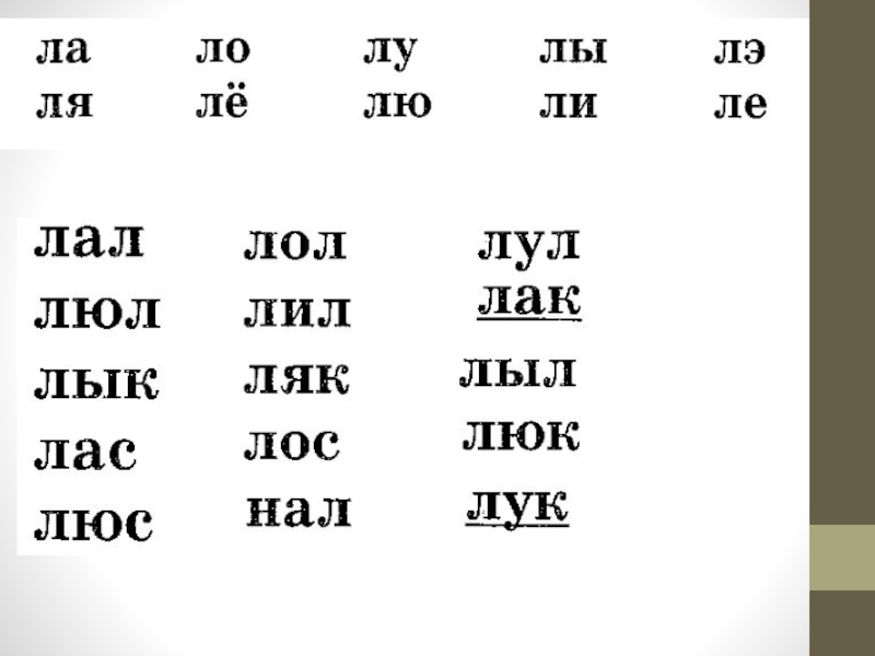 Презентация, доклад к уроку обучения грамоте: Звуки л, л. Буквы Л,л. Закрепление