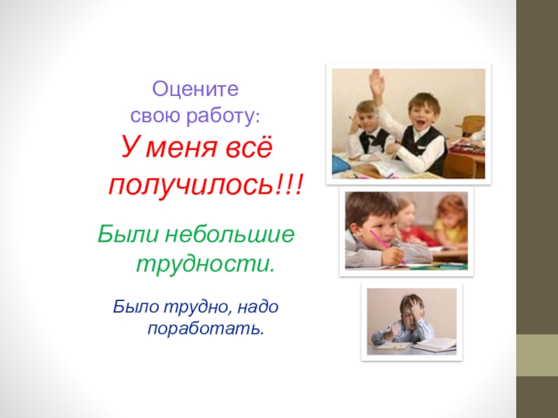 Оцените свою работу:У меня всё получилось!!!Были небольшие трудности.Было трудно, надо поработать.