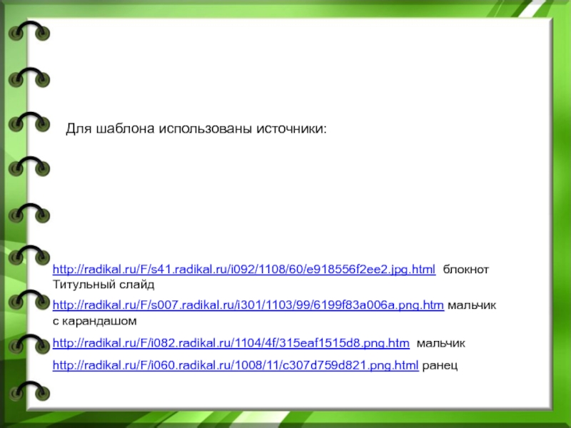 http://radikal.ru/F/s41.radikal.ru/i092/1108/60/e918556f2ee2.jpg.html блокнотТитульный слайдhttp://radikal.ru/F/s007.radikal.ru/i301/1103/99/6199f83a006a.png.htm мальчик с карандашом http://radikal.ru/F/i082.radikal.ru/1104/4f/315eaf1515d8.png.htm мальчикhttp://radikal.ru/F/i060.radikal.ru/1008/11/c307d759d821.png.html ранецДля шаблона использованы источники: