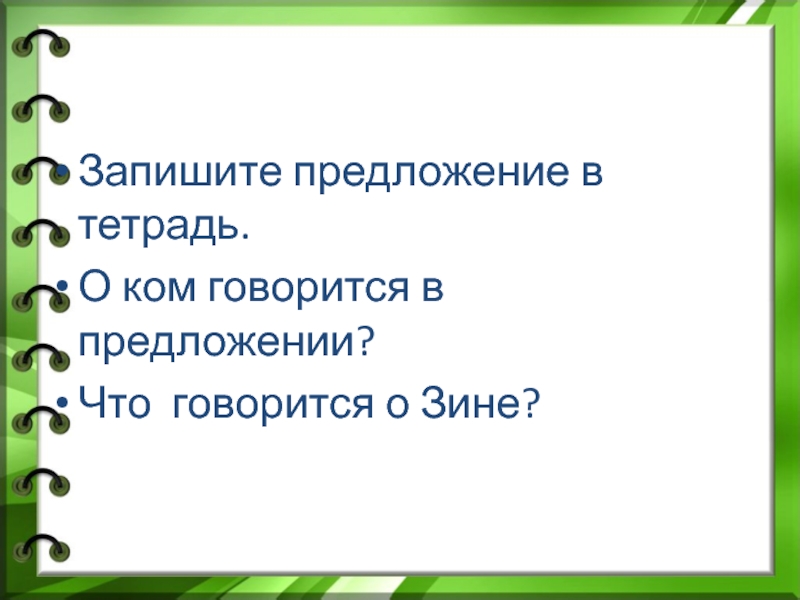 Запишите предложение в тетрадь.О ком говорится в предложении?Что говорится о Зине?