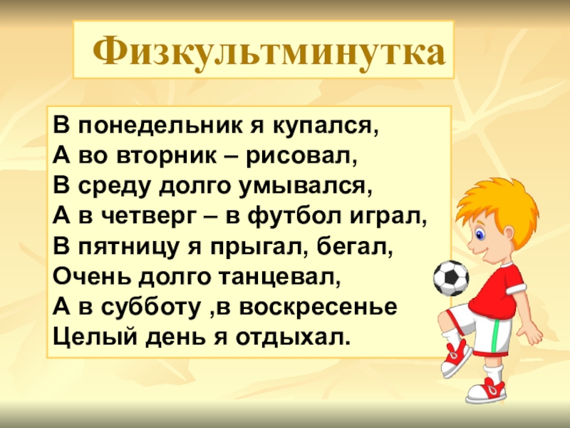 В понедельник я купался,А во вторник – рисовал,В среду долго умывался,А в четверг – в футбол играл,В