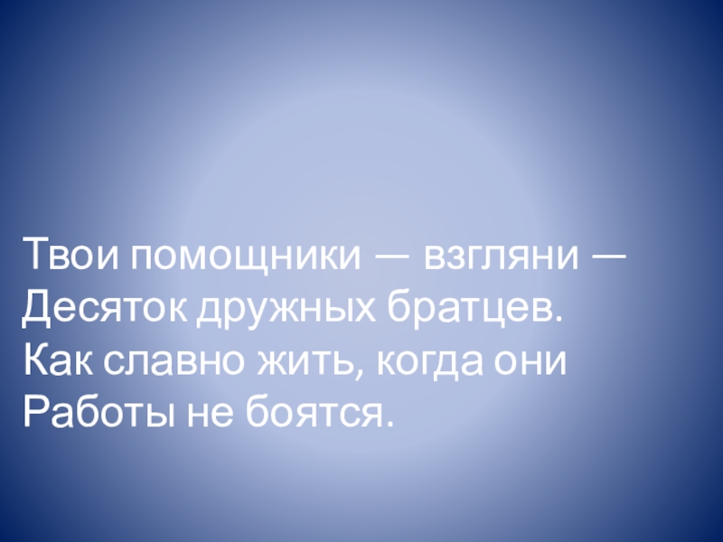 Твои помощники — взгляни —Десяток дружных братцев.Как славно жить, когда ониРаботы не боятся.