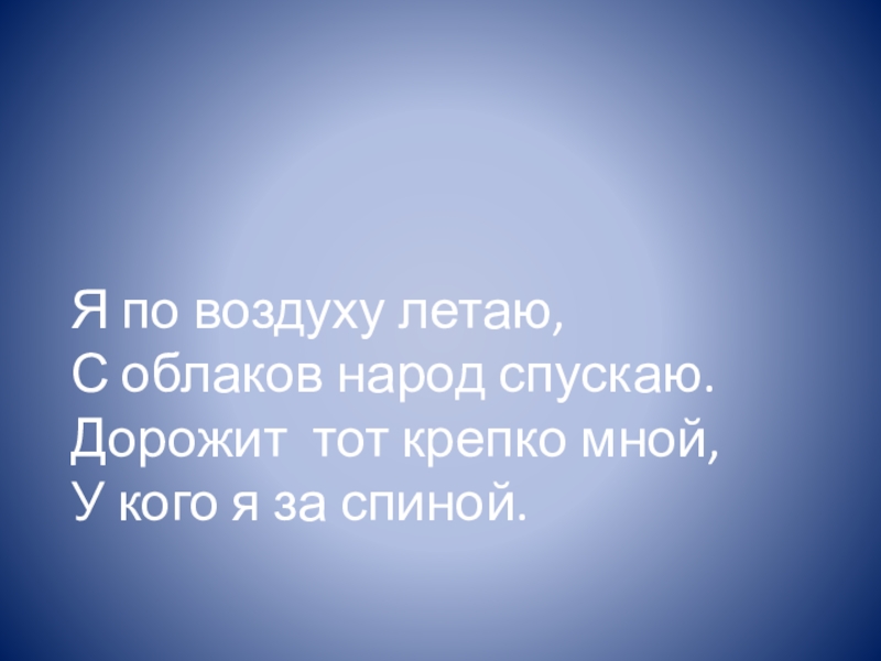 Я по воздуху летаю,С облаков народ спускаю.Дорожит тот крепко мной,У кого я за спиной.