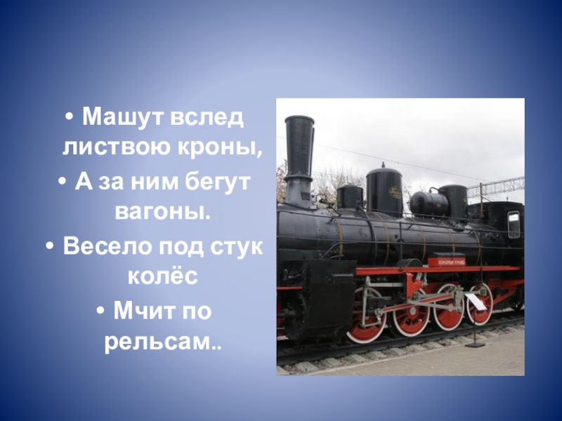 Машут вслед листвою кроны, А за ним бегут вагоны. Весело под стук колёс Мчит по рельсам..
