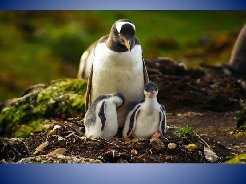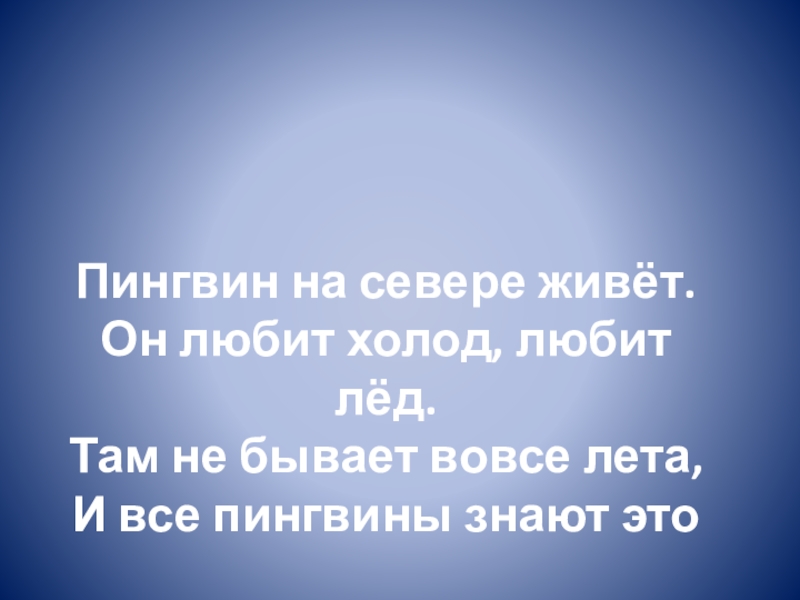 Пингвин на севере живёт. Он любит холод, любит лёд. Там не бывает вовсе лета, И все пингвины