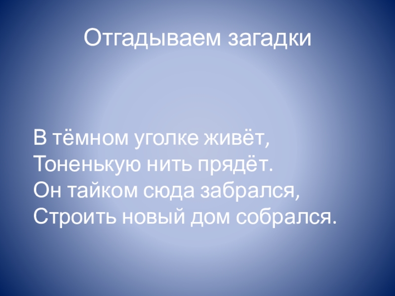 Отгадываем загадкиВ тёмном уголке живёт,Тоненькую нить прядёт.Он тайком сюда забрался,Строить новый дом собрался.