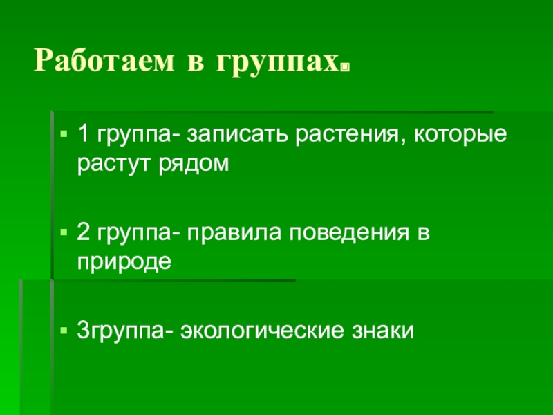 Работаем в группах.1 группа- записать растения, которые растут рядом2 группа- правила поведения в природе3группа- экологические знаки