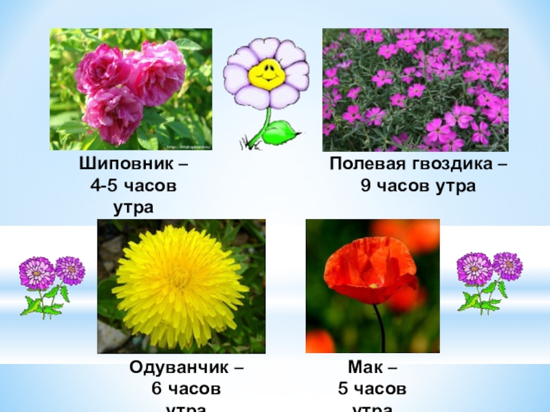 Шиповник –4-5 часов утраПолевая гвоздика –9 часов утраОдуванчик –6 часов утраМак –5 часов утра