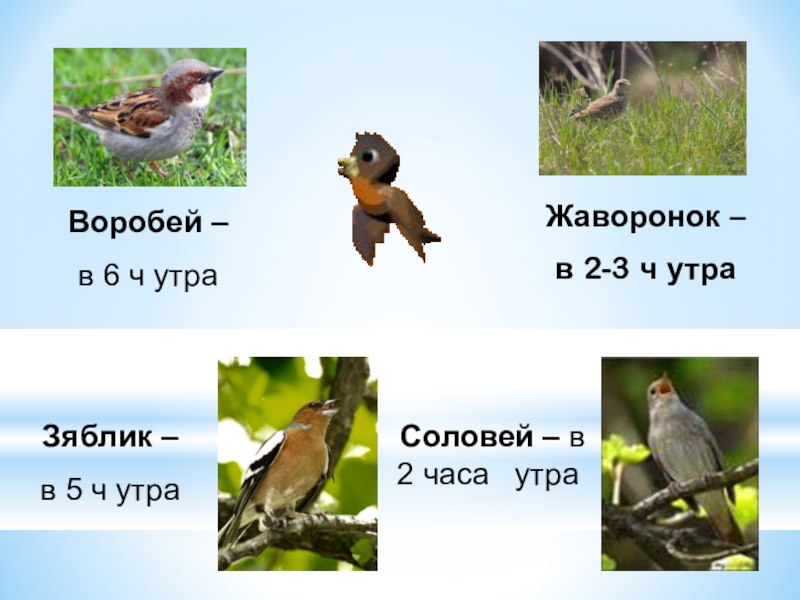 Соловей – в 2 часа  утраЖаворонок – в 2-3 ч утраЗяблик – в 5 ч утраВоробей