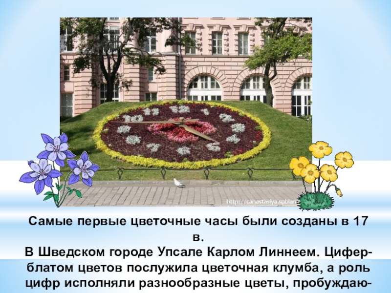 Самые первые цветочные часы были созданы в 17 в.В Шведском городе Упсале Карлом Линнеем. Цифер-блатом цветов послужила