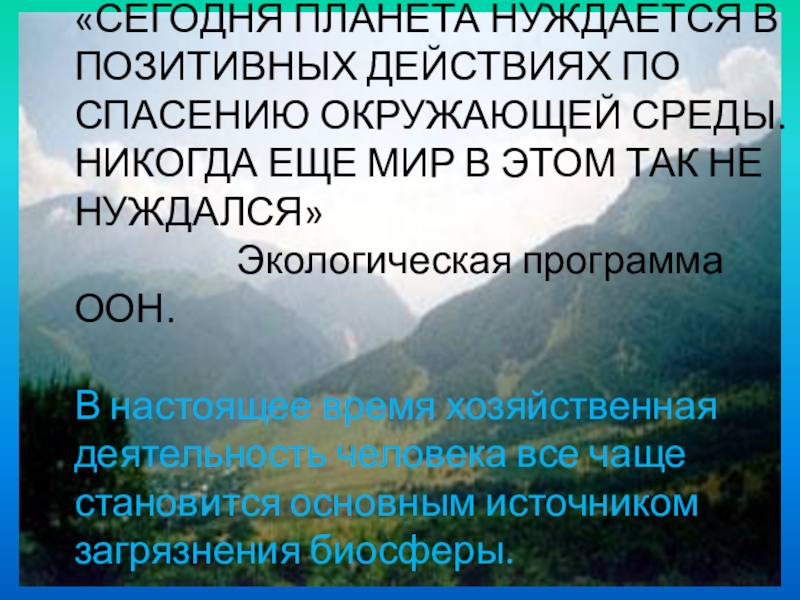 «СЕГОДНЯ ПЛАНЕТА НУЖДАЕТСЯ В ПОЗИТИВНЫХ ДЕЙСТВИЯХ ПО СПАСЕНИЮ ОКРУЖАЮЩЕЙ СРЕДЫ. НИКОГДА