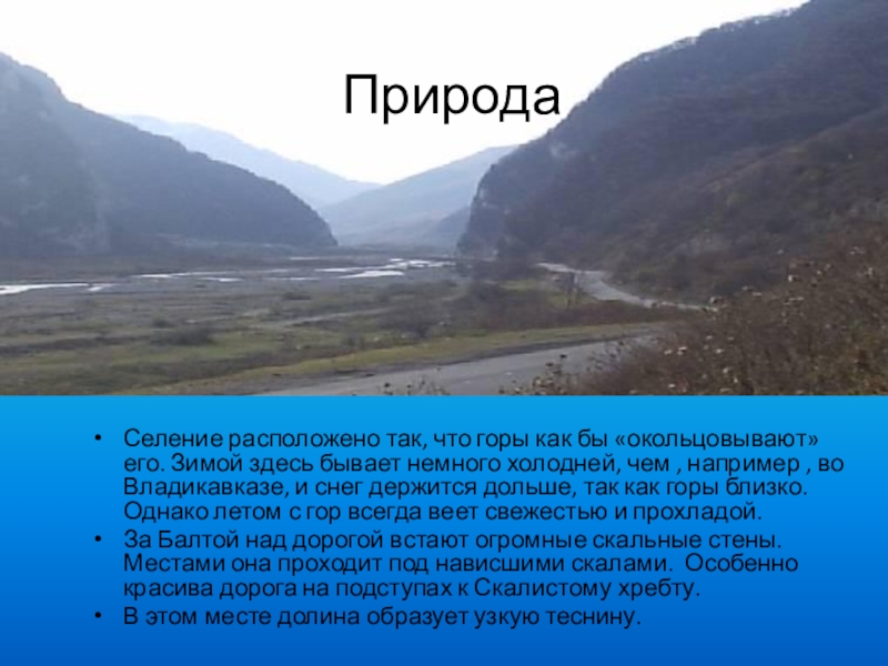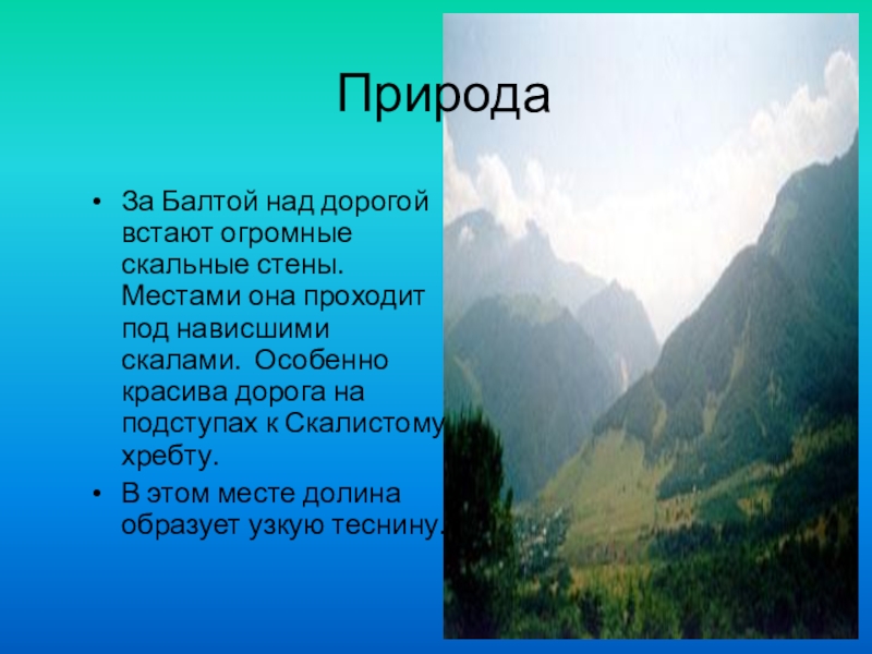 За Балтой над горой встают огромные скальные стены. Местами она проходит прямо над нависшими скалами. Особенно красива дорога на подступах к Скалистому хребту. В этом месте долина Терека образует узкую теснину наподобие гигантских естественных ворот.