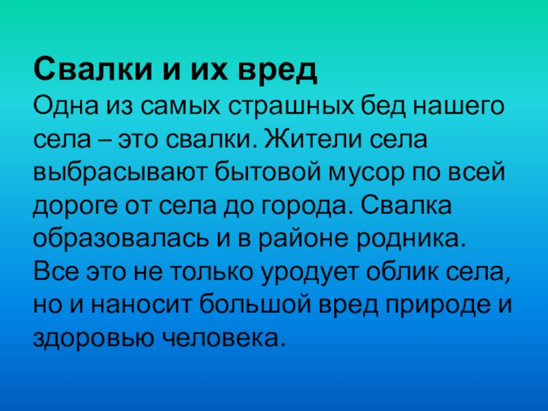 Все это не только уродует облик села, но и наносит большой вред природе и здоровью человека.