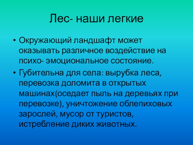 Губительна для села: вырубка леса, перевозка доломита в открытых машинах(оседает пыль на деревьях при перевозке), уничтожение облепиховых зарослей, мусор от туристов, истребление диких животных.