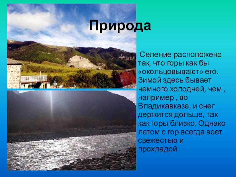 Селение расположено так, что горы как бы «окольцовывают» его. Зимой