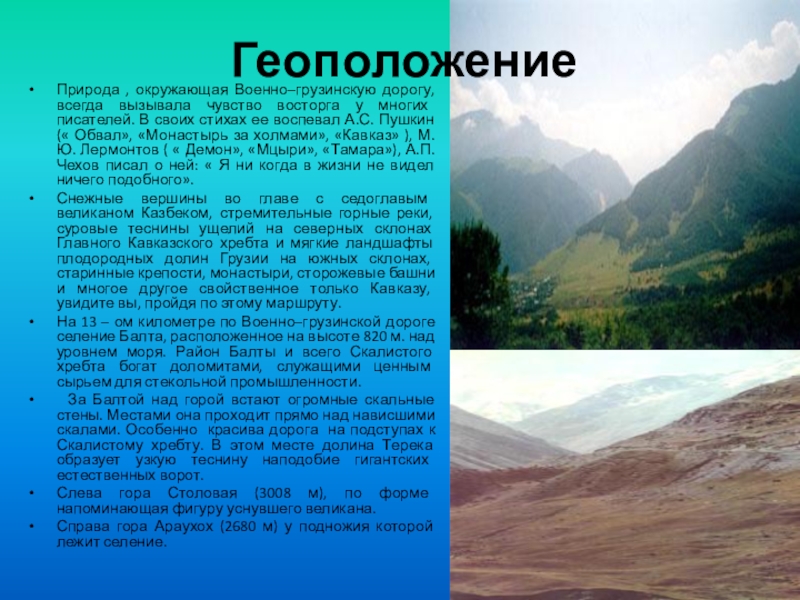 Природа , окружающая Военно–грузинскую дорогу, всегда вызывала чувство восторга у многих