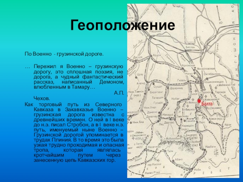Как торговый путь из Северного Кавказа в Закавказье Военно – грузинская дорога известна с древнейших времен. О ней в l веке до н.э. писал Стробон, а в l веке н.э. путь, именуемый ныне Военно – Грузинской дорогой упоминается в трудах Плиния. В то время это была узкая трудно проходимая и опасная тропа, которая являлась кротчайшим путем через занесенную цепь Кавказских гор.