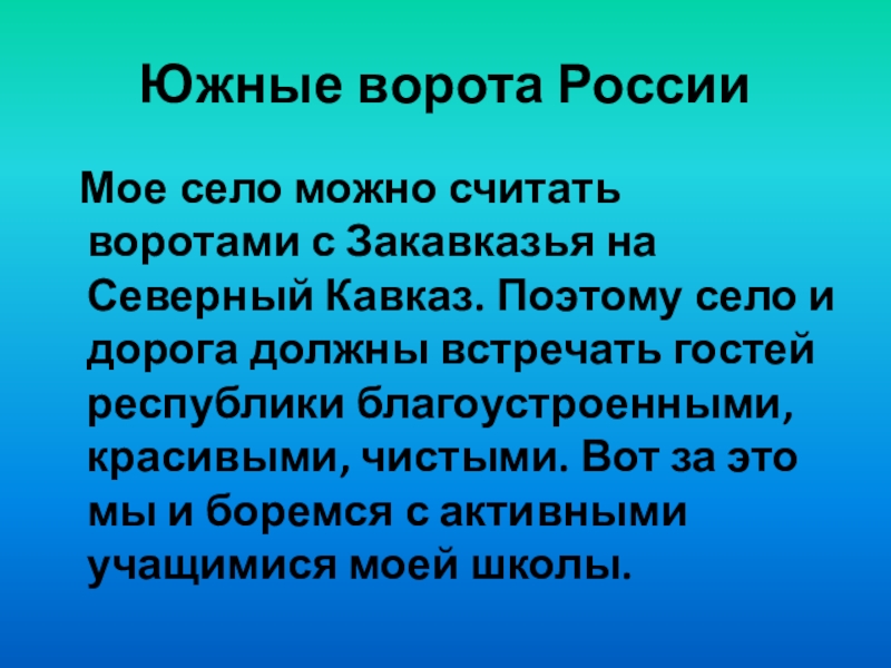 на Северный Кавказ. Поэтому село и дорога должны встречать гостей республики благоустроенными, красивыми, чистыми. Вот за это мы и боремся с активными учащимися моей школы.