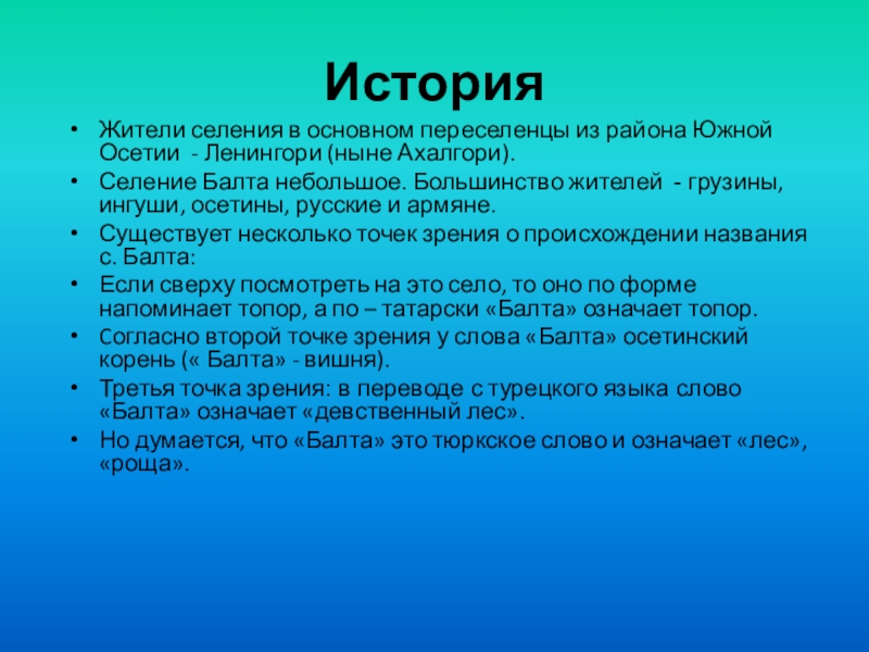 Cогласно второй точке зрения у слова «Балта» осетинский корень (« Балта» - вишня).