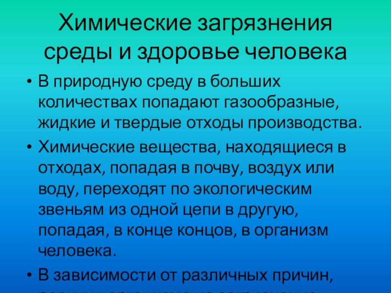 Слайд 7Химические загрязнения среды и здоровье человека