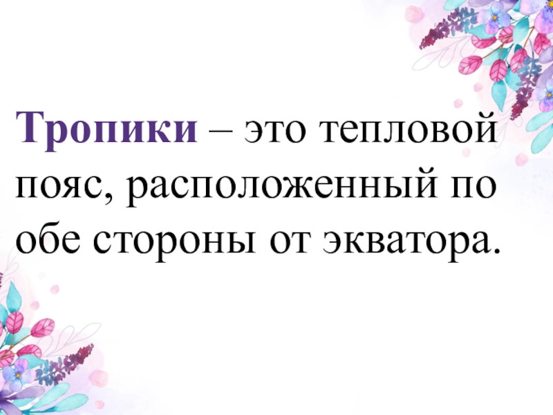 Слайд 5Тропики – это тепловой пояс, расположенный по обе стороны от экватора.