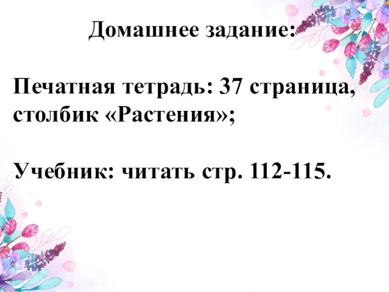 Домашнее задание:Печатная тетрадь: 37 страница, столбик «Растения»; Учебник: читать стр. 112-115.