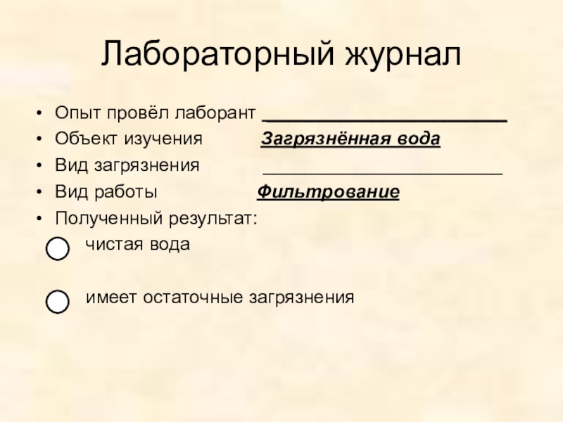 Лабораторный журналОпыт провёл лаборант _______________________Объект изучения      Загрязнённая водаВид загрязнения
