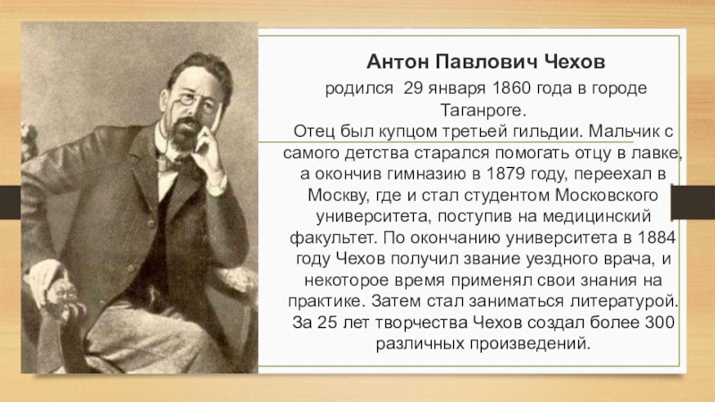 Отец был купцом третьей гильдии. Мальчик с самого детства старался помогать отцу в лавке, а окончив гимназию в 1879 году, переехал в Москву, где и стал студентом Московского университета, поступив на медицинский факультет. По окончанию университета в 1884 году Чехов получил звание уездного врача, и некоторое время применял свои знания на практике. Затем стал заниматься литературой.