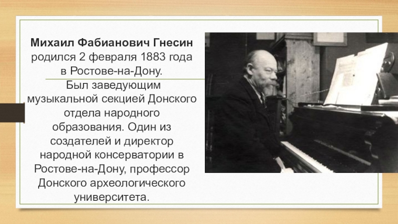 Слайд 5Михаил Фабианович Гнесин родился 2 февраля 1883 года в Ростове-на-Дону.