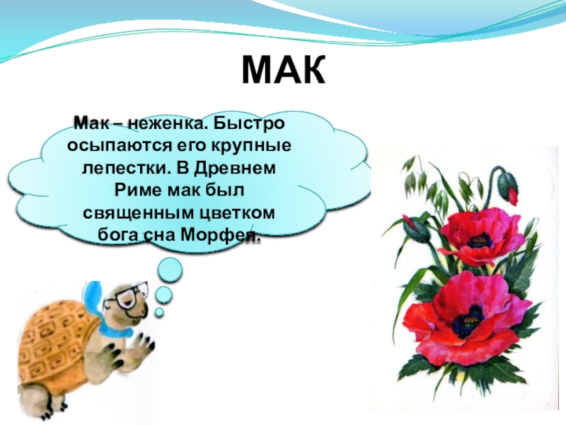 МАКМак – неженка. Быстро осыпаются его крупные лепестки. В Древнем Риме мак был священным цветком бога сна