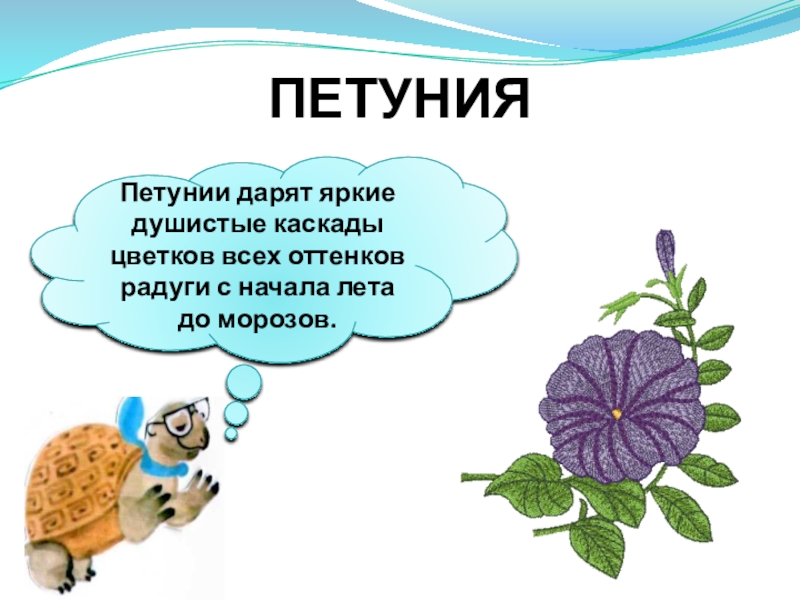 ПЕТУНИЯПетунии дарят яркие душистые каскады цветков всех оттенков радуги с начала лета