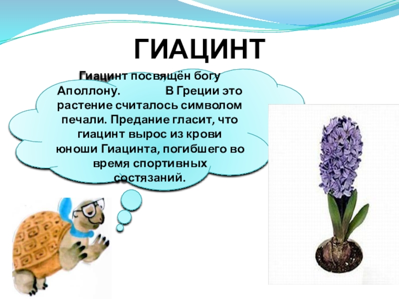 ГИАЦИНТГиацинт посвящён богу Аполлону.        В Греции это растение считалось символом