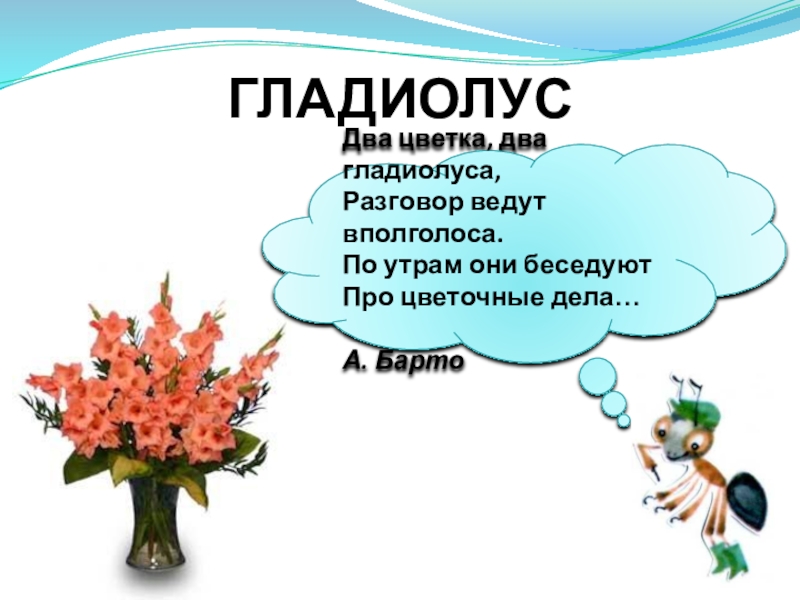 ГЛАДИОЛУСДва цветка, два гладиолуса, Разговор ведут вполголоса. По утрам они беседуют Про цветочные дела…