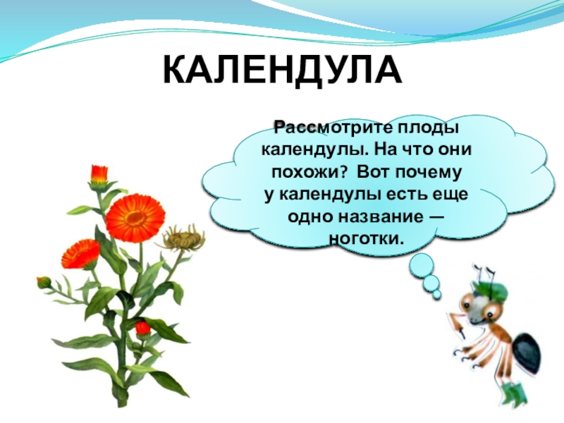 КАЛЕНДУЛА    Рассмотрите плоды календулы. На что они похожи? Вот почему у календулы есть еще одно название — ноготки.