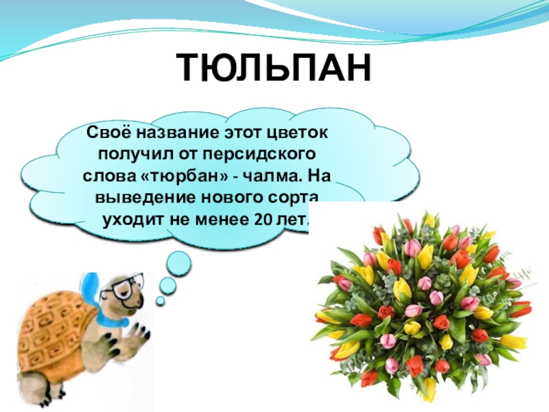ТЮЛЬПАНСвоё название этот цветок получил от персидского слова «тюрбан» - чалма. На выведение нового сорта уходит не