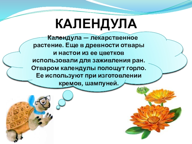 КАЛЕНДУЛА     Календула — лекарственное растение. Еще в древности отвары и настои из ее цветков использовали для заживления ран. Отваром календулы полощут горло.