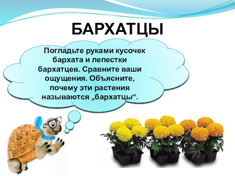 БАРХАТЦЫ     Погладьте руками кусочек бархата и лепестки бархатцев. Сравните ваши ощущения. Объясните, почему эти растения называются „бархатцы“.
