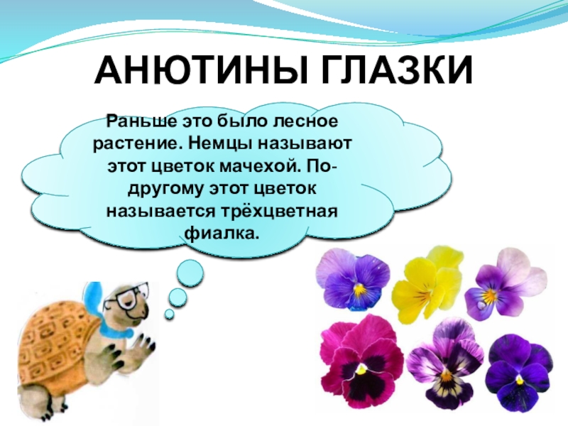 АНЮТИНЫ ГЛАЗКИРаньше это было лесное растение. Немцы называют этот цветок мачехой. По-другому этот цветок называется трёхцветная фиалка.