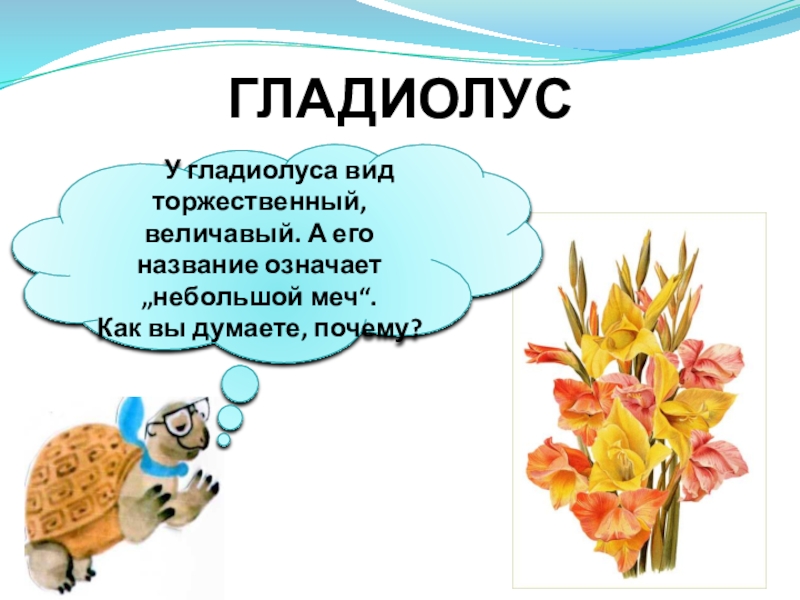 У гладиолуса вид торжественный, величавый. А его название означает „небольшой меч“.